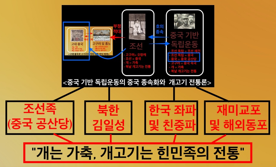 중국 소속인지 한국 소속인지 구분이 안 되는 한국 언론과 학계. 이들이 하나가 되어 미국의 영향력에서 벗어나 중국 공산당을 따르겠다고 선언한 것이 2001년 `개고기 불간섭 선언`이다. 이후 개고기 찬성파는 아무도 건드리지 못하는 거대 세력이 되어 한국을 집어삼켰다. 한국인이 개고기를 먹지 말자고 하면? 자국 문화를 비하하는 문화적 사대주의자라고 욕을 먹었다. 외국인이 개고기를 먹지 말라고 하면? 다문화를 존중하지 않는 차별주의자라고 욕을 먹었다.