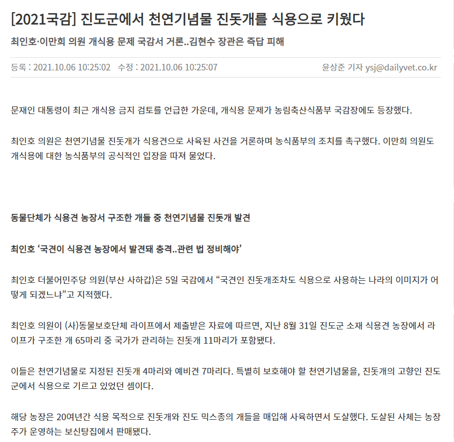 진정한 언론이라면 이런 참상을 저지른 개백정과 범죄자를 잡지 않는 정부와 경찰을 비난해야 한다. 책임자인 경찰, 정부, 개백정은 쏙 빠지고 피해 대상인 진돗개만 부각한 쓰나 마나 한 기사다.